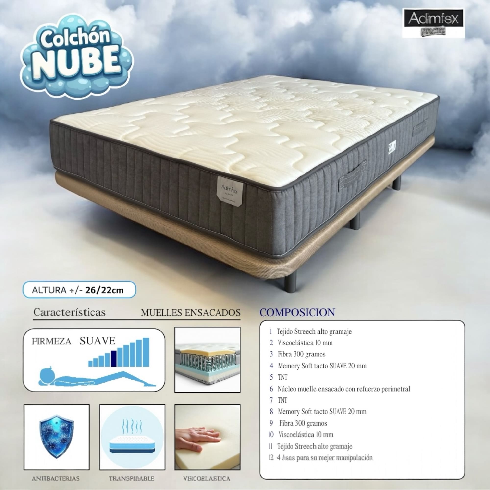 - Si estas buscando un colchón de alta calidad, confortable, a buen precio, que además tenga una firmeza suave con adaptabilidad y con esa sensación única que proporciona la transpirabilidad de los muelles ensacados embolsados individualmente. Sin duda, nuestro “Colchón de muelles ensacados Nube” te conquistara cada noche!