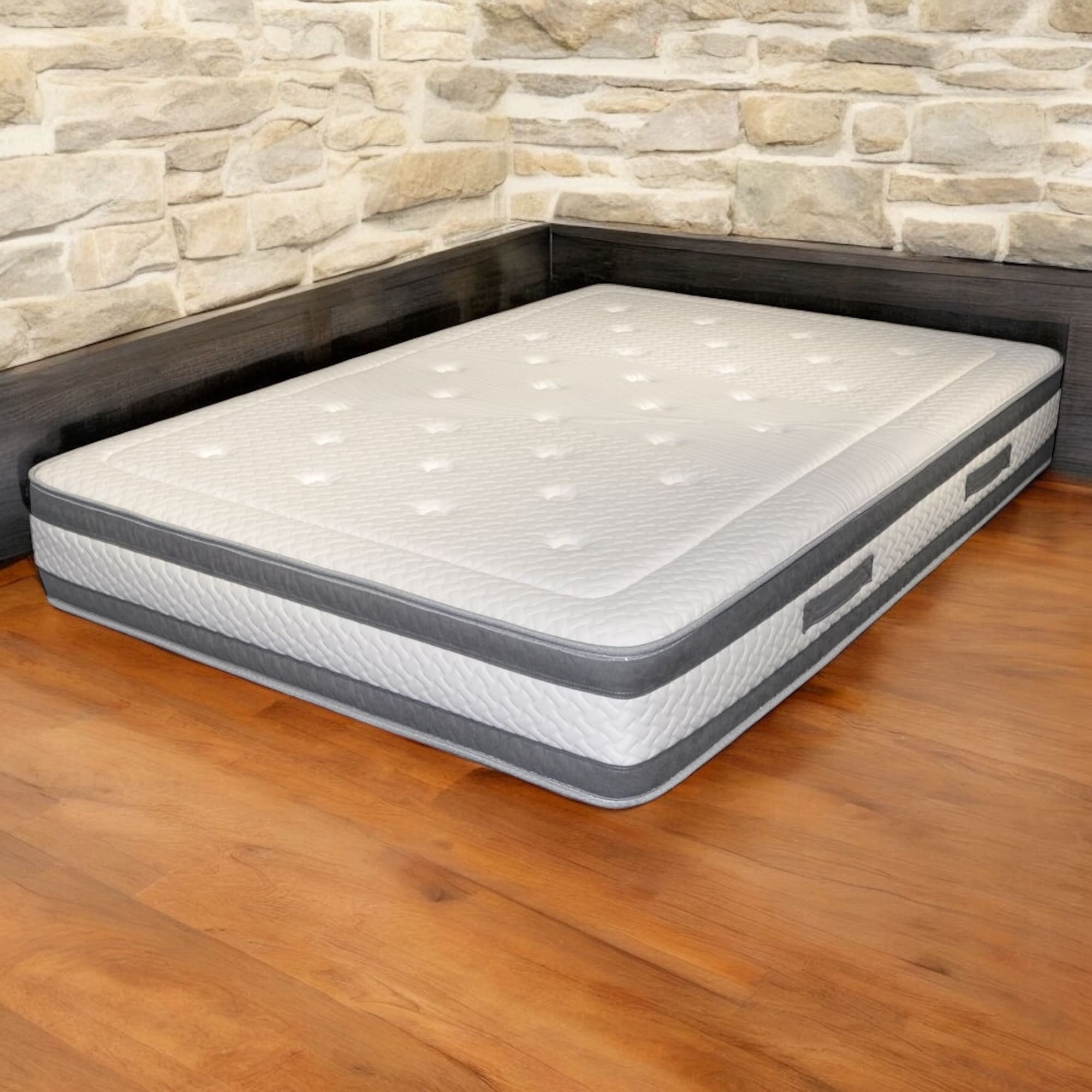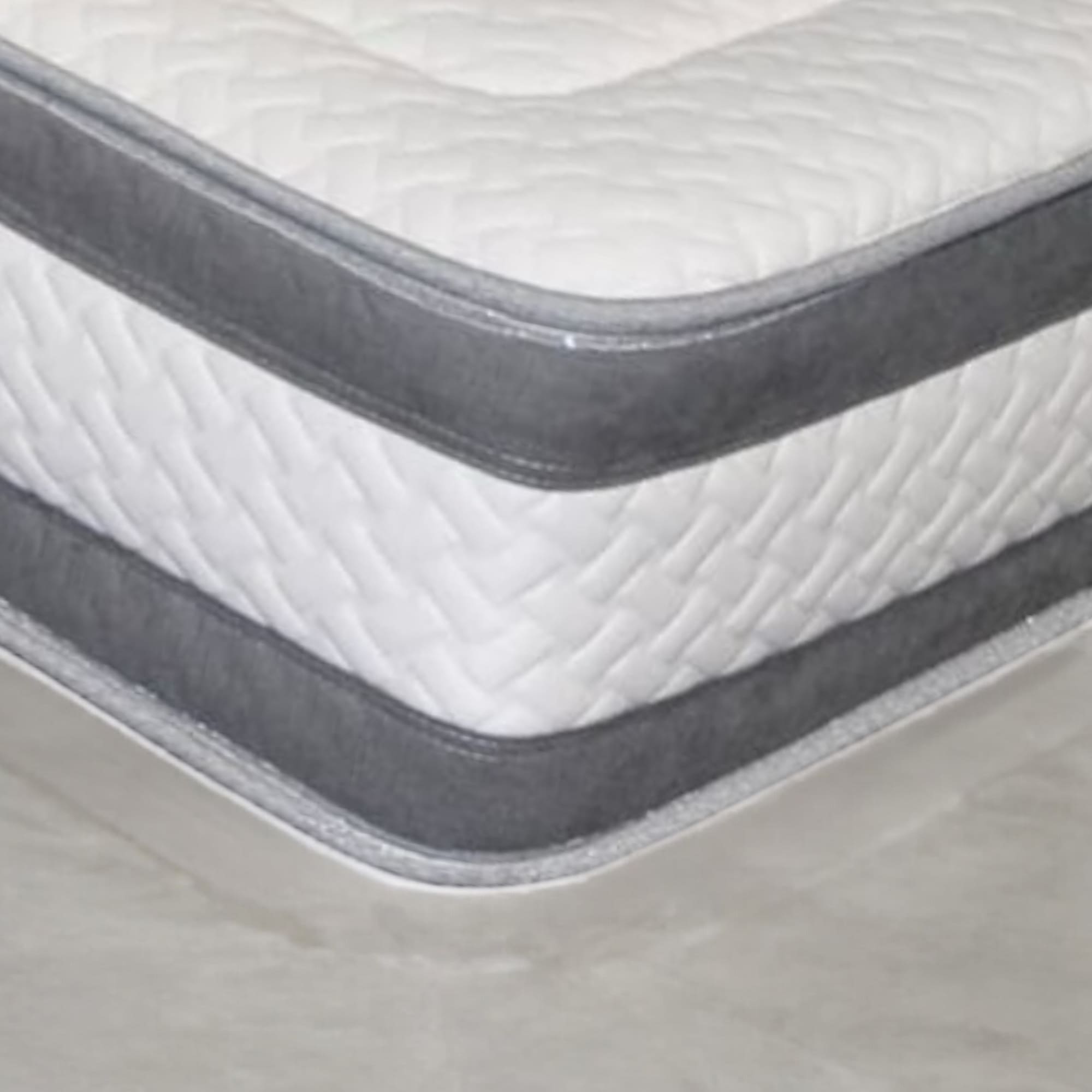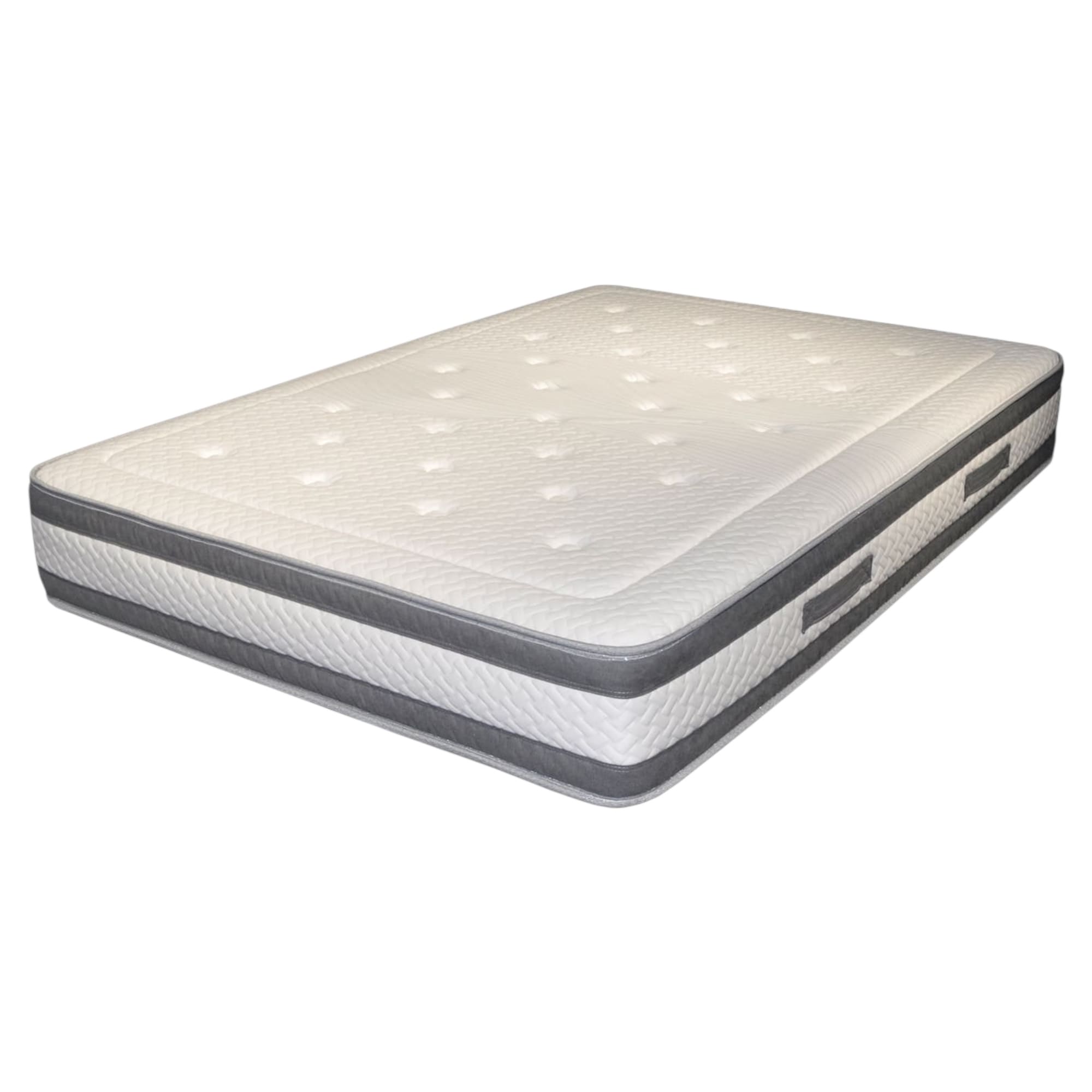• Tejido Microfibra transpirable y Strech belour, acolchado continuo en 10 mm de visco,  20 mm de Soft (espuma suave), espuma 25 Kg dura y fibra a ambas caras. Con un núcleo de muelles ensacados y embolsados.