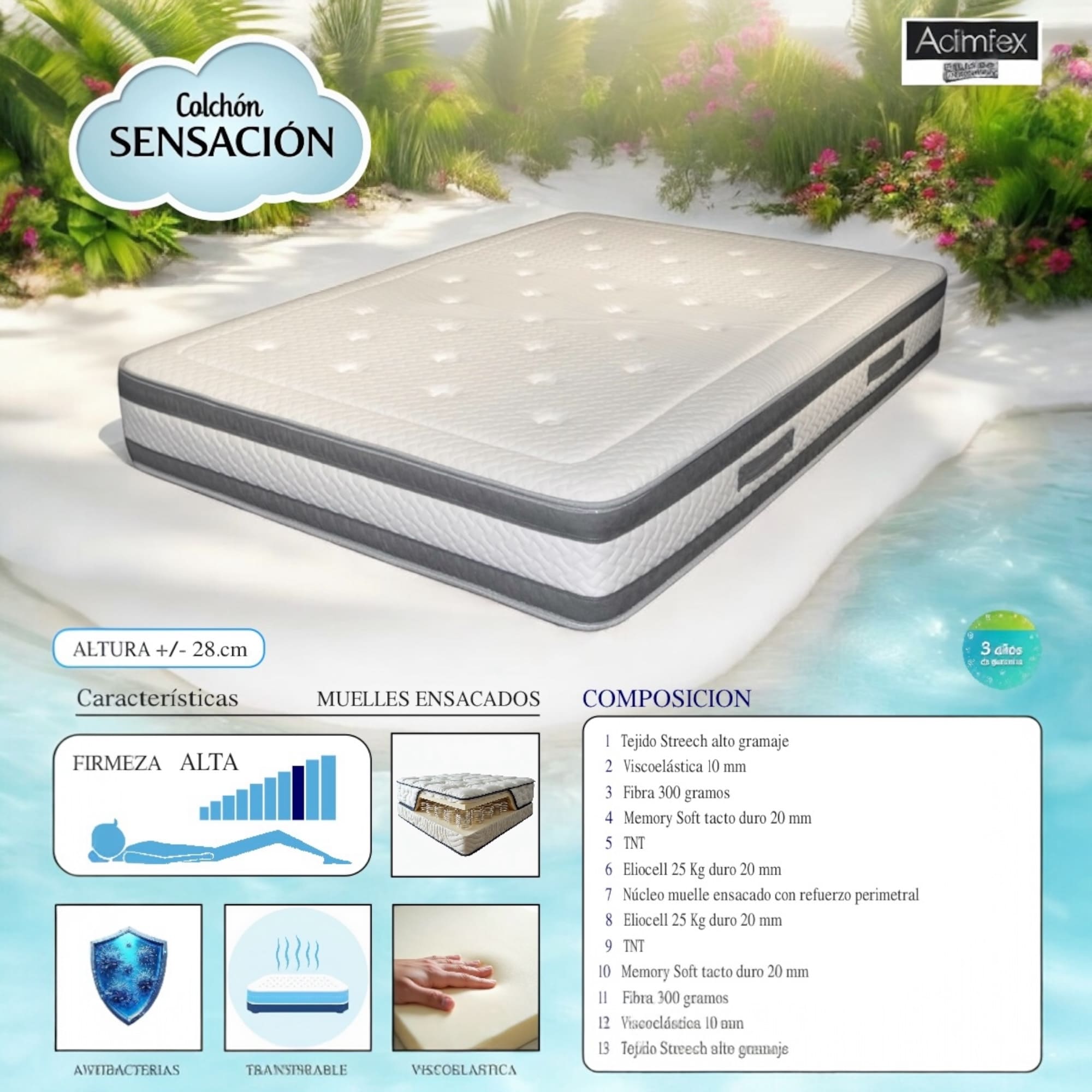 La altura total del Colchón de Muelles SENSACION, es de unos 28 cm.